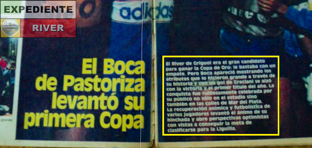 El 9 de enero de 1988 el ilusionante Boca de José Omar Pastoriza debutó en la Copa de Oro MDQ empatando 2 a 2 ante Independiente en el Estadio José María Minella. Cinco días más tarde un nuevo empate con idéntico marcador, esta vez ante Racing Club, dejó al xeneize en la segunda posición del cuadrangular debido a la recordada goleada 5 a 1 que el puntero River Plate le propinó a un pobre Independiente en la segunda fecha. Pero la derrota de Racing en el Clásico de Avellaneda, cuando no, entregó el torneo al ganador del Superclásico Mundial programado para la ronda final. Para los de casaca azul con franja amarilla se trataba de una oportunidad ideal para levantar una copa, brindar y saborear un buen trago de gloria (?), mientras que lo único que divisaron los de Núñez aquella vez fue la simple ocasión de ganarle al eterno rival una vez más y obtener otro campeonato extraoficial. Ni más ni menos de lo que verdaderamente representaba aquel encuentro. La definición se dio el 27 de enero en el Estadio José María Minella, donde el equipo de Pastoriza derrotó 1 a 0 a River Plate con gol de Alfredo Graciani. De esta manera, aquella noche Boca Juniors recibió las medallas ganadoras y se consagró campeón de la Copa de Oro MDQ. Finalizado el partido los futbolistas xeneizes comenzaron a cantar y celebrar de manera eufórica para minutos después culminar con una curiosa vuelta olímpica exhibiendo el trofeo. Al otro día, los principales medios deportivos se hicieron eco de este logro que sin lugar a dudas merece el rótulo de legendario. O al menos eso quiso instalar la prensa nacional al darle tanta trascendencia a un simple cotejo amistoso. Evidentemente en el fútbol argentino cada uno festeja lo que puede.